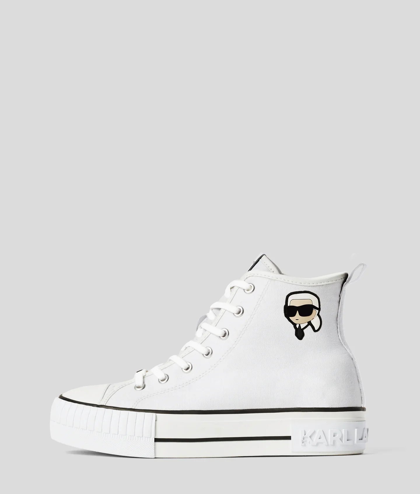 Crafted from Italian canvas, this KARL LAGERFELD high-top, graced with a distinctive NFT rubber dome patch, offers a lace-up design that complements its bold plateau midsole, ensuring an unmistakable fusion of comfort and avant-garde style.