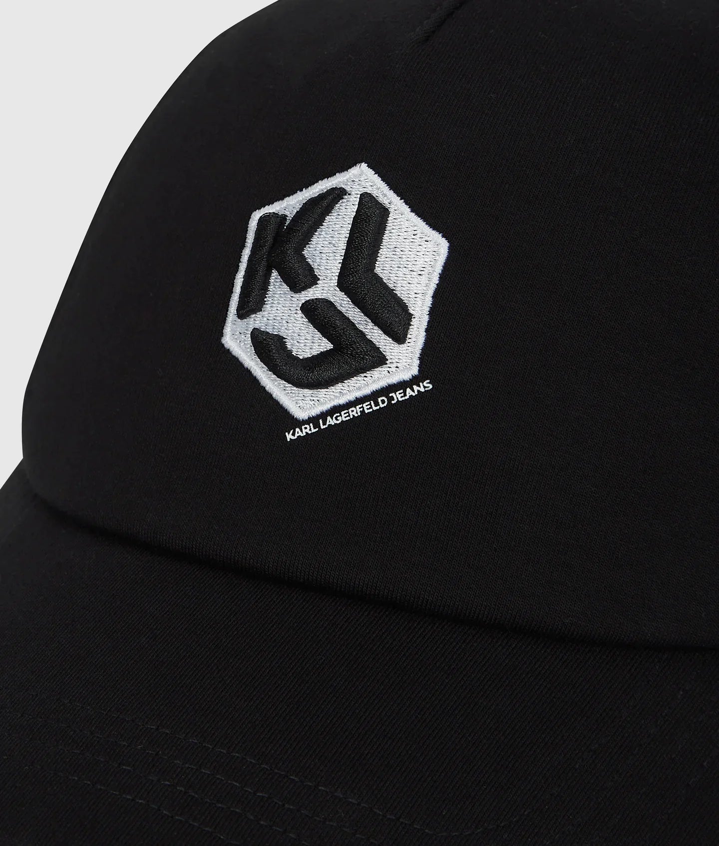 This curved peak trucker cap blends breathable mesh with a soft scuba material, accented by the iconic KLJ Monogram. The adjustable strap ensures a tailored fit.
