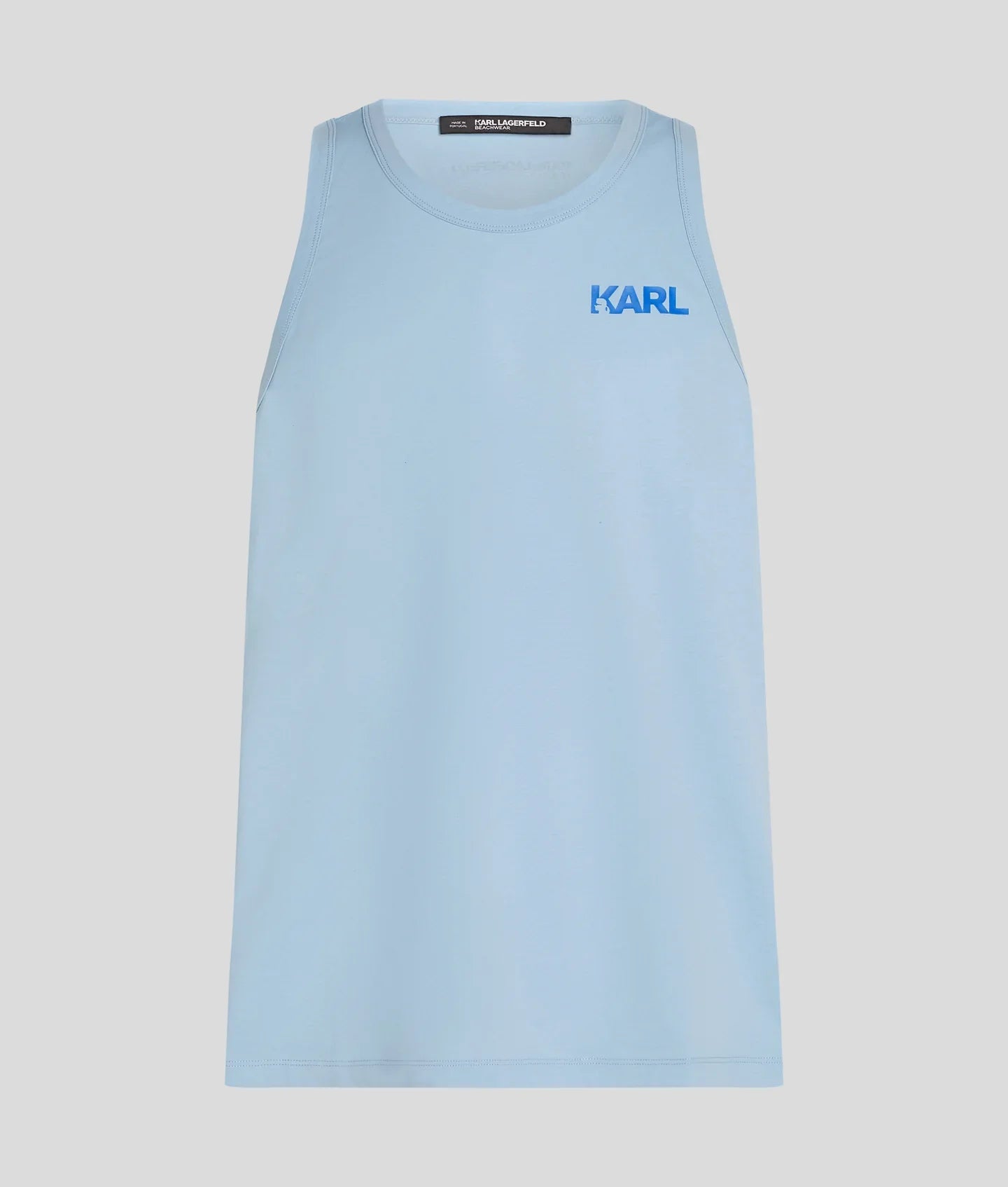 An ultra-lightweight beach tank top featuring a comfortable sleeveless design and a classic crew neck. The prominent KARL logo at the chest adds a statement touch, perfect for sunny days by the water.