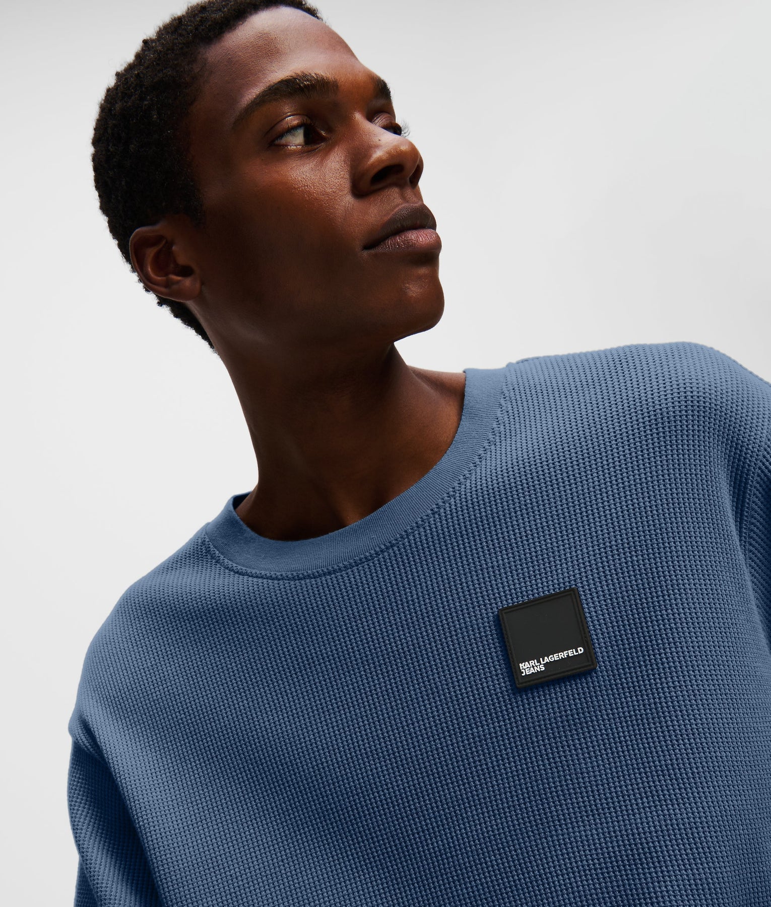 Channel effortless style with this statement waffle-textured t-shirt. Featuring a classic ribbed crew neck and short sleeves, anchored by a contrasting KARL LAGERFELD JEANS logo.