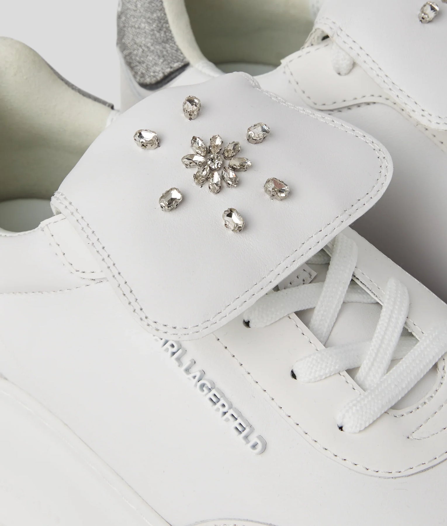 A striking blend of style and function, these sneakers feature a lace-up design complemented by a rhinestone-embellished tongue. The high wedge sole adds a touch of flair, while the glittering heel counter proudly showcases the KARL LAGERFELD logo.
