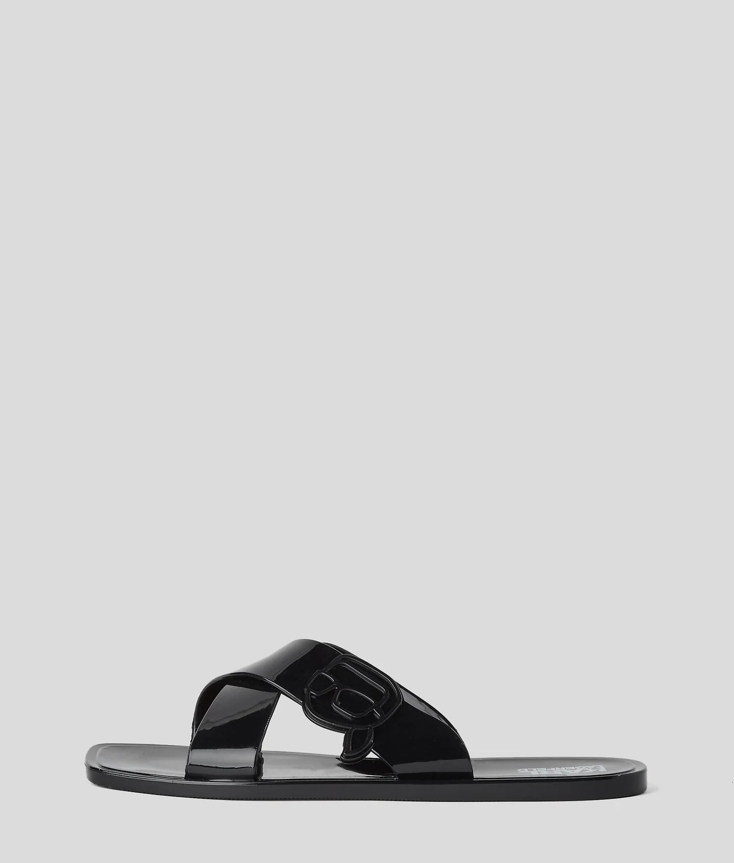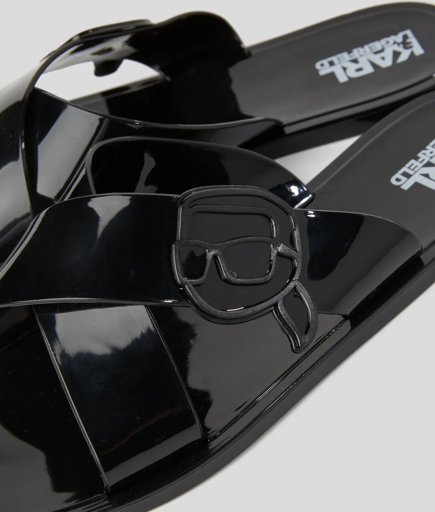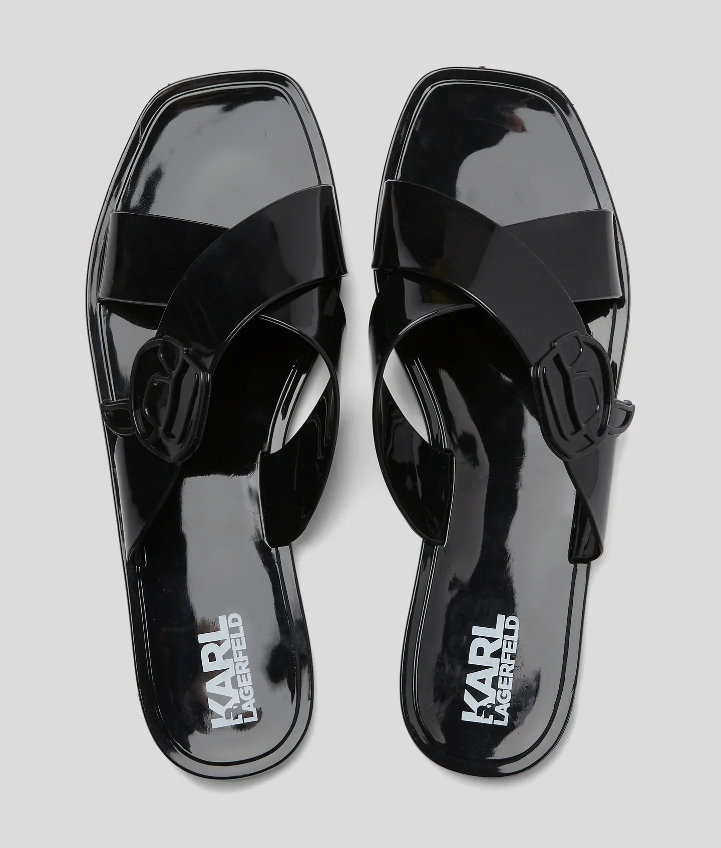 Crafted from high shine leather, these KARL LAGERFELD sandals are a sleek slip-on style, featuring a branded footbed for deluxe comfort and an exclusive KARL NFT rubber patch.